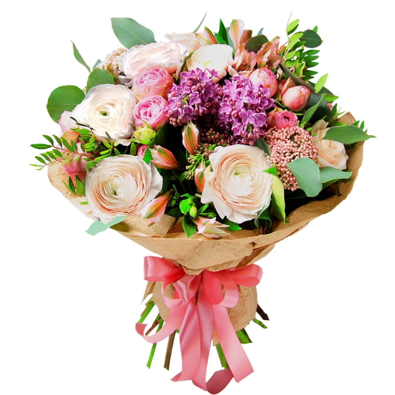 Букет состоит из 5 ранункулюсов, 2 розы, 2 ветки кустовых роз, 2 альстромерии, 1 сирень, 3 озотамнус, зелень, крафт, атласная лента.