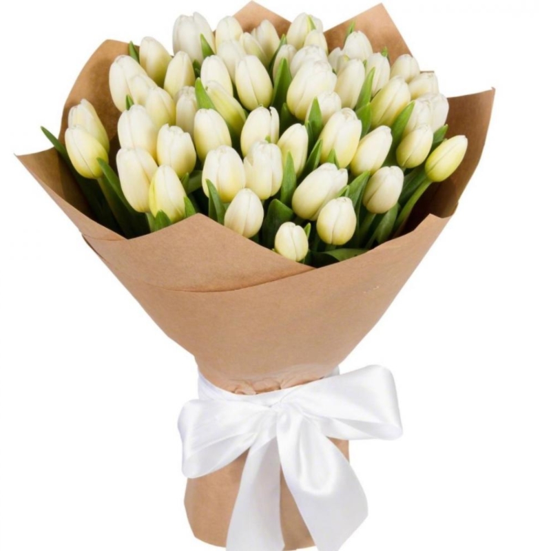 Букет состоит из 35 белых тюльпанов, крафт, атласная лента.
