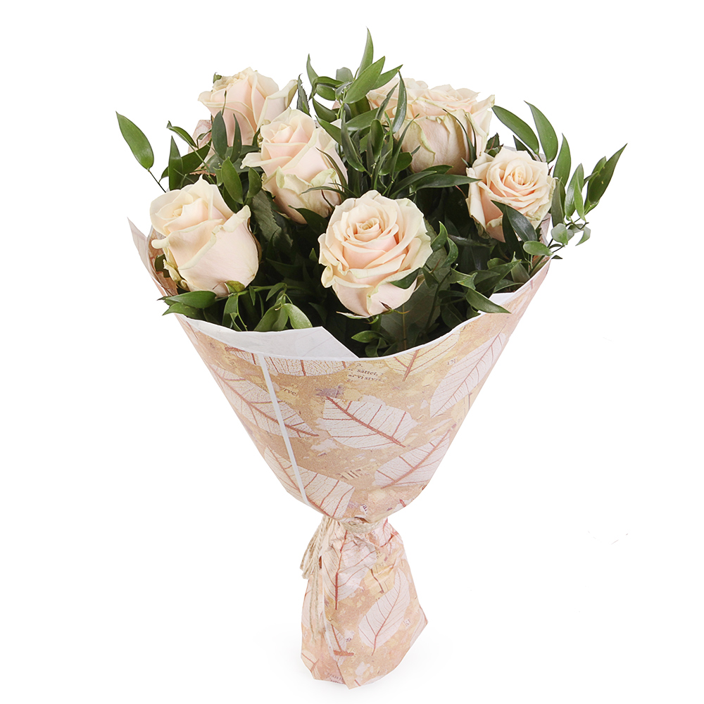 Букет состоит из 7 белых роз, зелень, крафт.